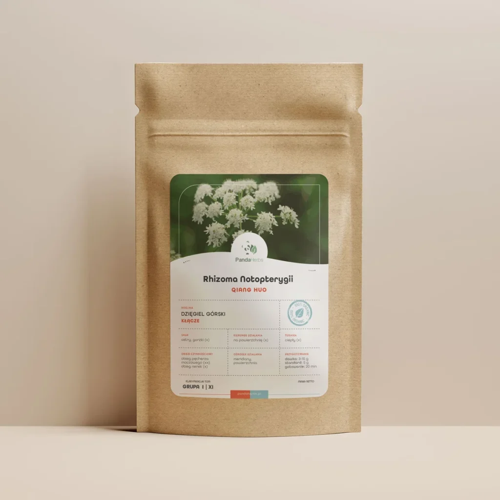 Qiang Huo (Rhizoma Notopterygii, kłącze dzięgla górskiego) to zioło TCM rozpraszające wiatr-zimno i osuszające wilgoć. Stosowane przy przeziębieniach z dreszczami, bólach głowy i karku, reumatyzmie, napięciu i ograniczeniu ruchomości. Łagodzi ból, otwiera meridiany i wspiera odporność. Podawane jako odwar lub składnik receptur na bóle z komponentą zimna, wilgoci, Qi stagnacji i powierzchniowego napięcia.
