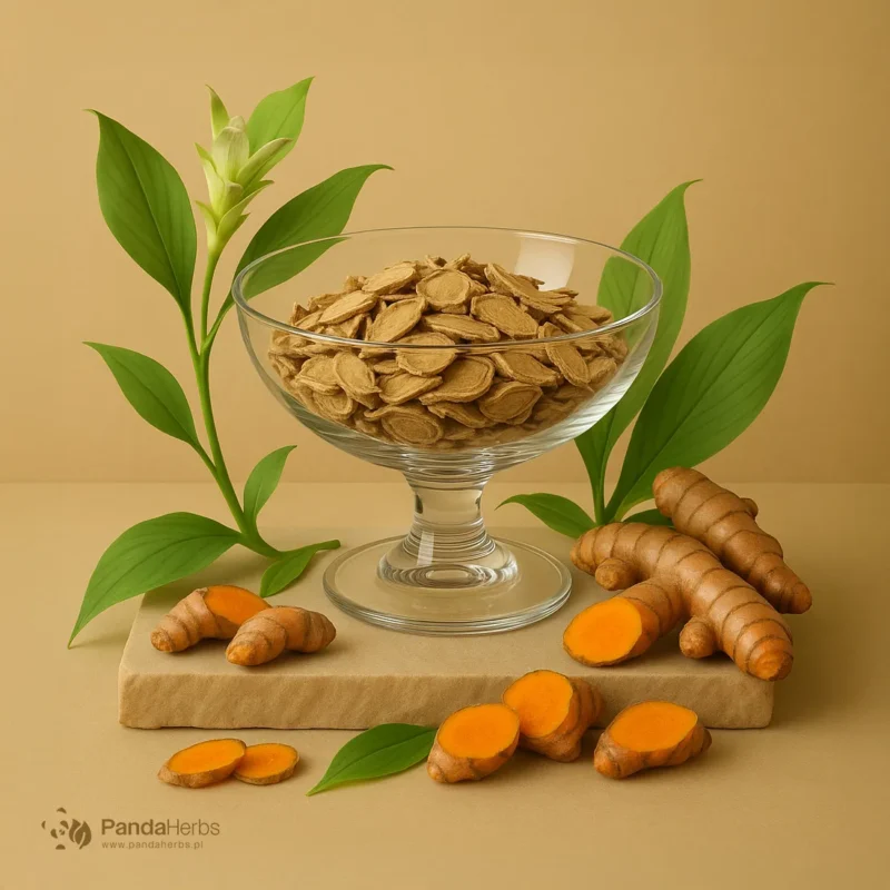 Rozróżnienie gatunków źródłowych: Na rynku dostępne korzenie najczęściej pochodzą od Curcuma wenyujin, nie od Curcuma longa. Oba gatunki są akceptowane przez farmakopeę chińską, ale warto świadomie sprawdzać pochodzenie surowca u dostawcy.