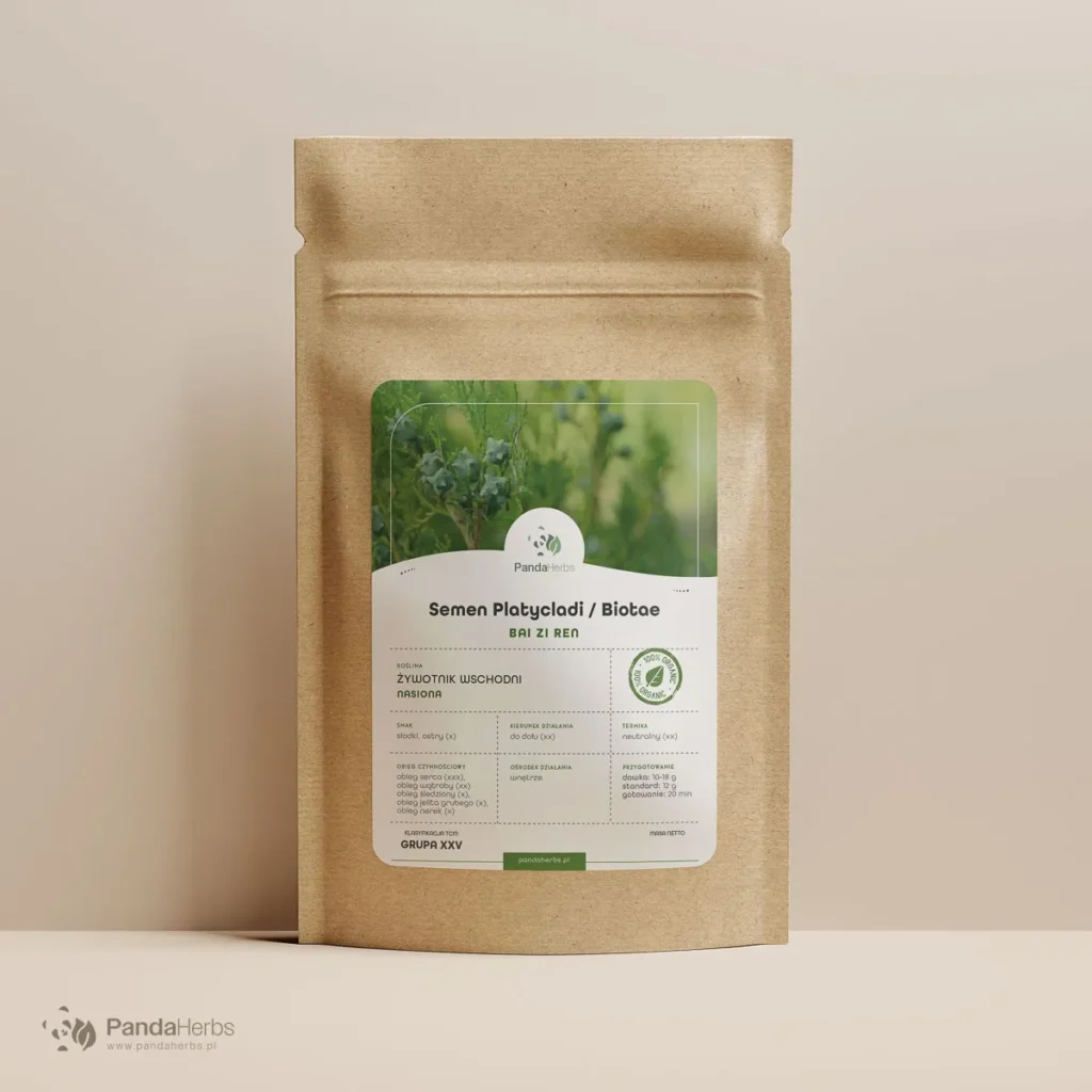 Nasiona żywotnika wschodniego (Bai Zi Ren) to surowiec ceniony przy bezsenności, nocnym poceniu się i uporczywych zaparciach związanych z suchością organizmu. Jeśli budzisz się w nocy z kołataniem serca, odczuwasz niepokój i masz trudności z ponownym zaśnięciem — Bai Zi Ren może pomóc. Biota orientalis (syn. Platycladus orientalis) z rodziny cyprysowatych dostarcza nasion bogatych w flawonoidy i terpenoidy o potwierdzonym działaniu uspokajającym. W medycynie chińskiej odżywia Krew Serca i uspokaja Shen — ducha odpowiedzialnego za jakość snu.