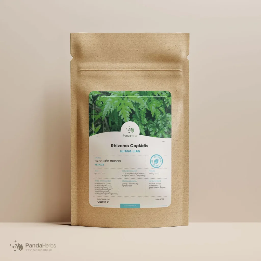 Cynowód chiński (Huang Lian) to jedno z najsilniej działających ziół chłodzących w tradycyjnej medycynie chińskiej — może wspierać organizm przy problemach żołądkowych, uporczywych biegunkach, stanach zapalnych jamy ustnej i skóry oraz wewnętrznym niepokoju z bezsennością. Kłącze Coptis chinensis zawiera do 13% alkaloidów z dominującą berberyną — związkiem o szerokim spektrum działania przeciwbakteryjnego, przeciwzapalnego i metabolicznego. W tradycji chińskiej to zioło kierunkowe dla meridianu serca, ochładzające ogień i usuwające wilgotne gorąco.